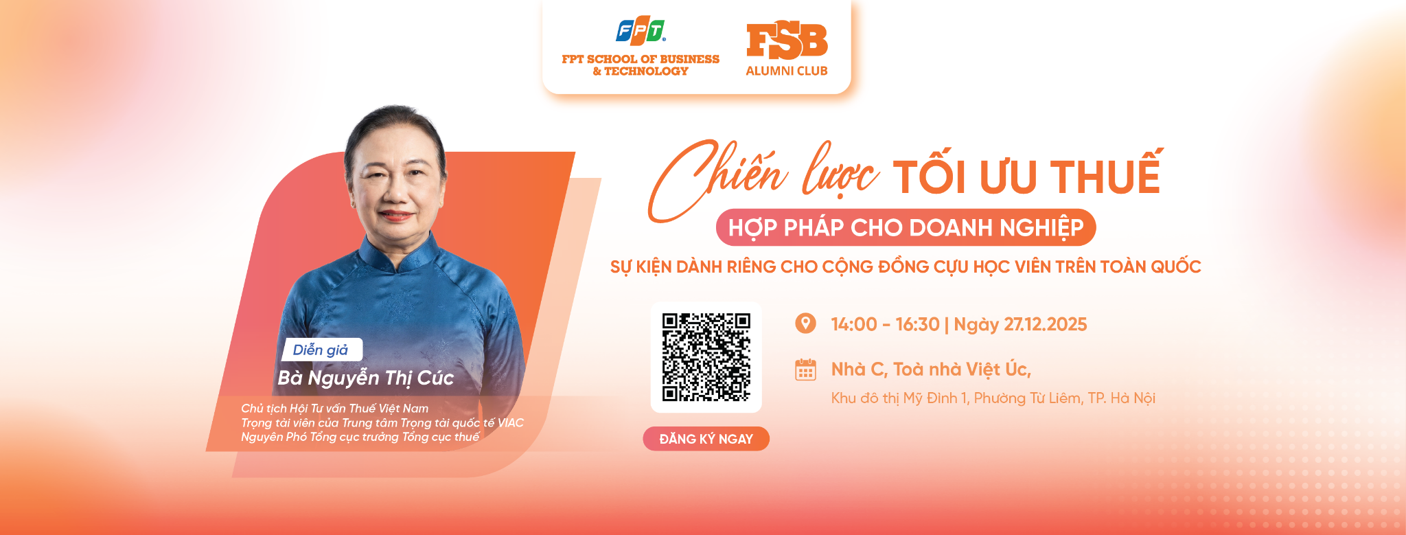 Viện Quản trị & Công nghệ FSB trân trọng giới thiệu Alumni Workshop #12 với chủ đề “Chiến lược Tối ưu Thuế hợp pháp cho Doanh nghiệp”, một nội dung nhận được nhiều sự quan tâm từ các nhà quản trị, chủ doanh nghiệp và cộng đồng Cựu học viên FSB. Chương trình có sự dẫn dắt của Bà Nguyễn Thị Cúc – Chủ tịch Hội Tư vấn Thuế Việt Nam, Trọng tài viên VIAC và nguyên Phó Tổng cục trưởng Tổng cục Thuế, hứa hẹn mang đến những phân tích chuyên sâu, cập nhật xu hướng và gợi ý giải pháp tối ưu thuế hợp pháp giúp doanh nghiệp vận hành hiệu quả và giảm thiểu rủi ro pháp lý.