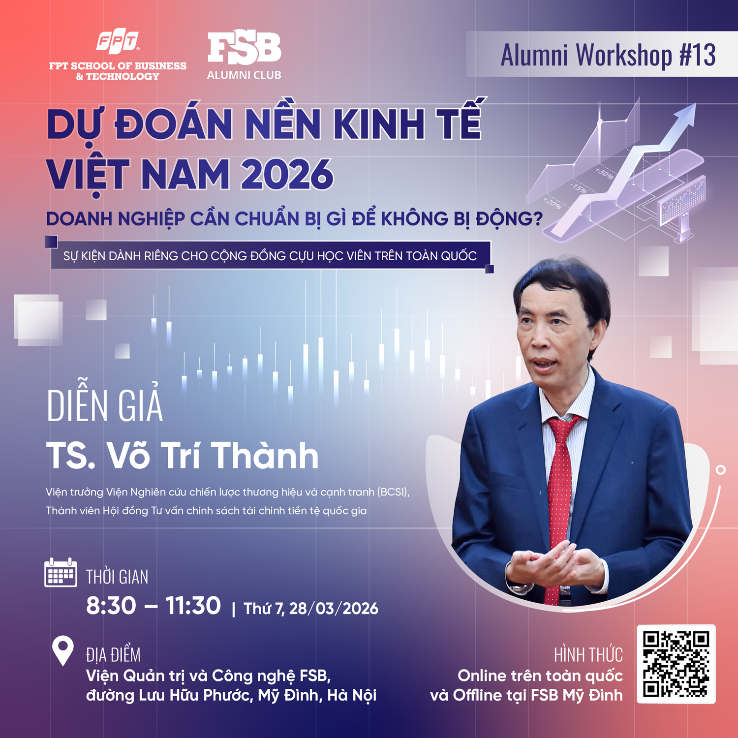 Tại FSB Alumni Workshop #13, TS. Võ Trí Thành sẽ mang đến những góc nhìn đa chiều về triển vọng kinh tế Việt Nam 2026, đồng thời chia sẻ các khuyến nghị thiết thực giúp doanh nghiệp chuẩn bị nguồn lực và nắm bắt cơ hội ngay từ đầu năm.