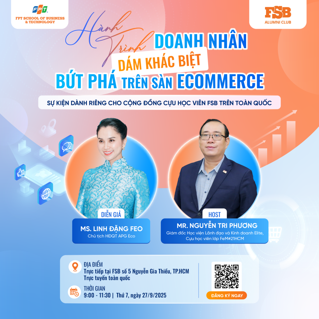 Trong bối cảnh thương mại điện tử bùng nổ, nhiều doanh nhân Việt Nam đã dám khác biệt khi đưa nông sản và hàng truyền thống từ chợ quê, siêu thị lên các sàn Ecommerce hiện đại. Họ biến những sản phẩm quen thuộc thành thương hiệu được thị trường săn đón, góp phần tái định vị giá trị truyền thống trong kỷ nguyên số. Chính hành trình đầy cảm hứng ấy sẽ được tái hiện tại Alumni Talk #11 do FSB tổ chức – nơi khát vọng đổi mới gặp tinh thần bứt phá, nơi doanh nhân không chỉ đơn thuần kinh doanh mà còn tạo dựng giá trị bền vững, kết nối cộng đồng và khẳng định bản lĩnh tiên phong trên thương trường số.