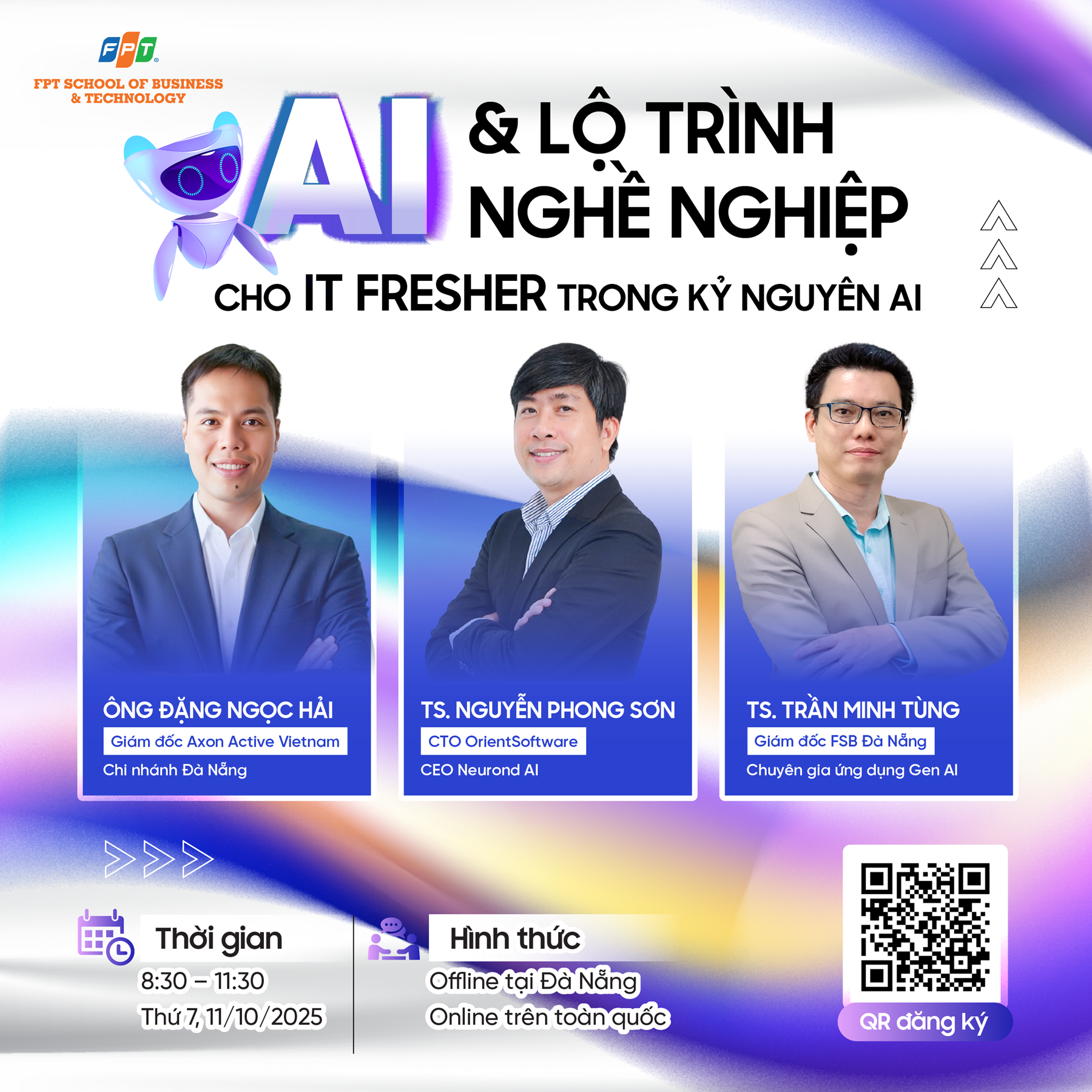 Tháng 10 này, Viện Quản trị & Công nghệ FSB mang đến một Workshop đặc biệt: “AI & Lộ trình nghề nghiệp cho IT Fresher trong kỷ nguyên AI”. Đây sẽ là nơi sinh viên IT và các bạn trẻ mới ra trường tìm thấy định hướng nghề nghiệp rõ ràng, lắng nghe những câu chuyện thực tế từ các chuyên gia công nghệ hàng đầu.