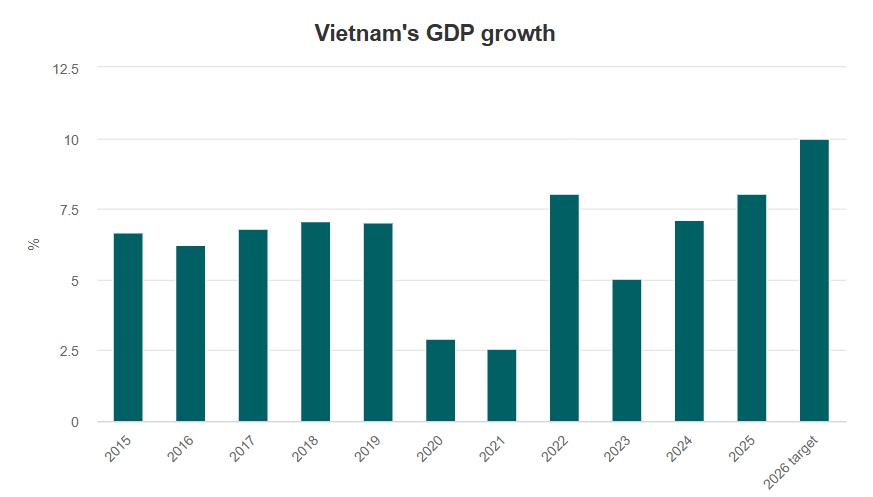 Vietnam is eyeing double-digit economic growth in 2026 and, and aims to become an upper-middle-income economy by 2030 and a high-income one by 2045.